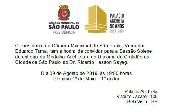 Dia 9/8, em SP, acontece a sessão solene de entrega da "Medalha Anchieta e do Diploma de Gratidão da Cidade de São Paulo" a Ricardo Hasson Sayeg (HSLAW). "Recebo estas honorarias em nome de nosso trabalho de mais de uma década liderando o GCapH, que é o Núcleo de Inteligência de Combate à Pobreza da PUC-SP, homenageando todas as pessoas que com ele contribuíram e o apoiam", emociona-se o homenageado. (Clique aqui)