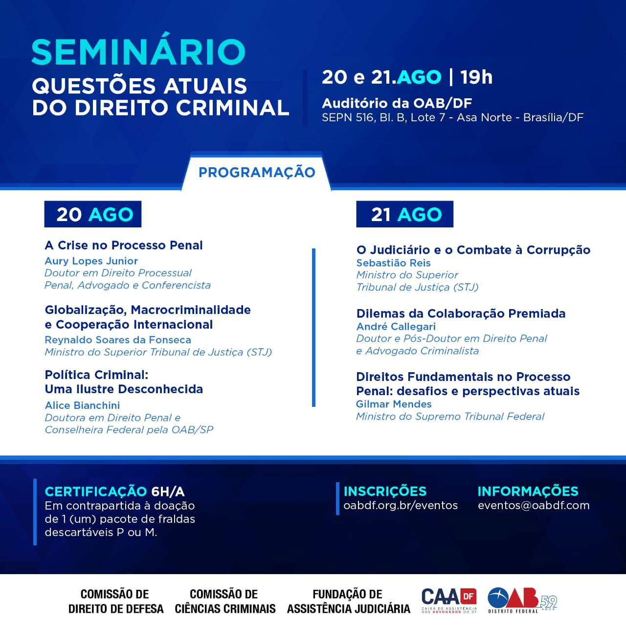 Dias 20 e 21/8, em Brasília, será realizado o seminário "Questões Atuais do Direito Criminal". Os ministros do STJ, Reynaldo Soares da Fonseca e Sebastião Reis, e o ministro do STF, Gilmar Mendes, além de Aury Lopes Junior, Alice Bianchini e André Callegari serão os palestrantes. (Clique aqui)