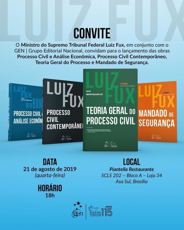 Ministro Luiz Fux e a Editora Forense lançam as obras "Processo Civil e Análise Econômica", "Processo Civil Contemporâneo", "Teoria Geral do Processo Civil" e "Mandado de Segurança". O evento será em Brasília, no Piantella Restaurante, às 18h. (Clique aqui)