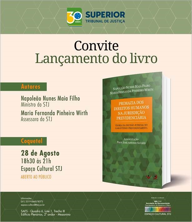 Será lançado no próximo dia 28 o título "Primazia dos Direitos Humanos na Jurisdição Previdenciária", de autoria do ministro Napoleão Nunes Maia Filho e de Maria Fernanda Pinheiro Wirt. O evento será em Brasília, no Espaço Cultural STJ, das 18h30 às 21h. (Clique aqui)