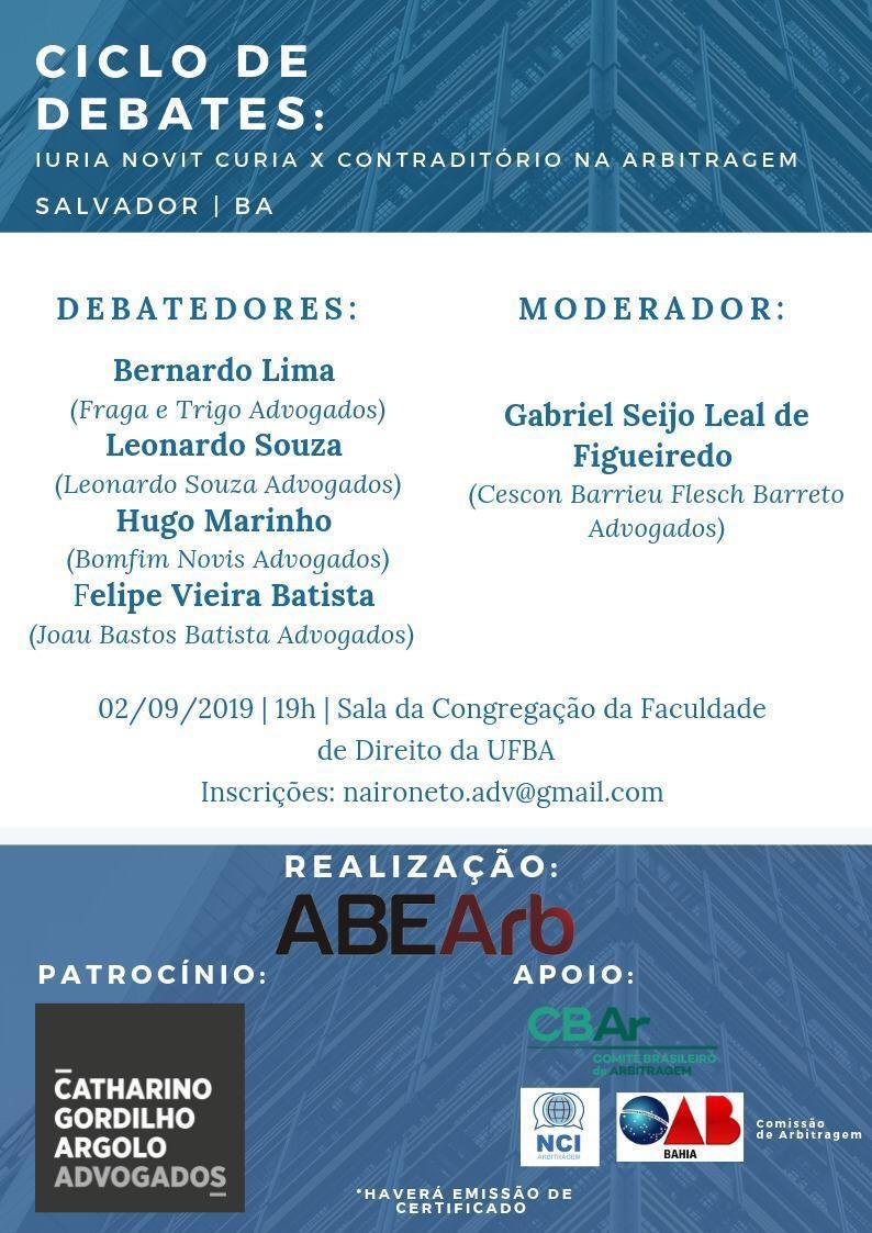 Bernardo Lima, do escritório Fraga & Trigo Advogados, é um dos convidados do "Ciclo de Debates: Iuria Novit Curia x Contraditório na Arbitragem", dia 2/9, na faculdade de Direito da UFBA, em Salvador. O moderador do debate será Gabriel Seijo Leal de Figueiredo, da banca Cescon Barrieu Advogados. (Clique aqui)