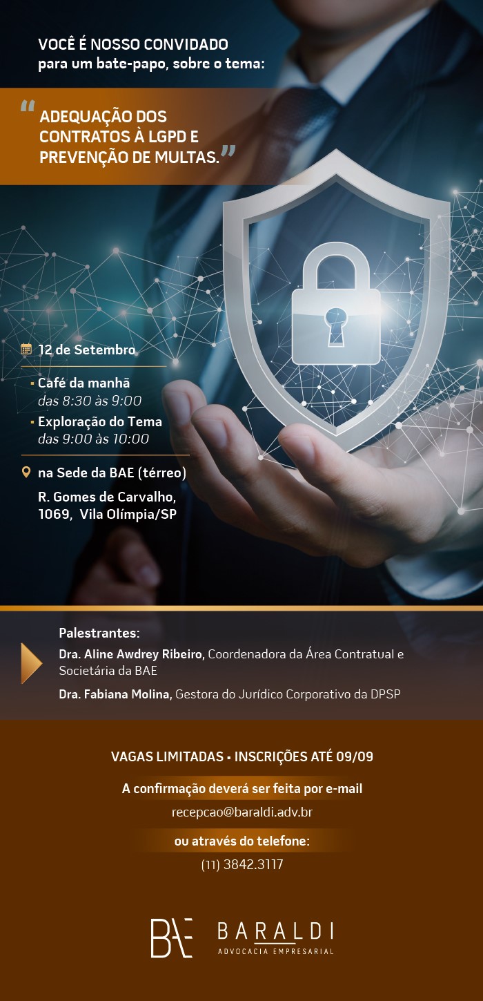 Baraldi Advocacia Empresarial realiza, dia 12/9, em SP, bate-papo sobre a "Adequação dos Contratos à LGPD e Prevenção de Multas". (Clique aqui)