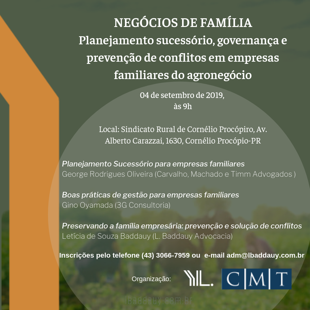 Dia 4/9, em Cornélio Procópio/PR, o escritório L. Baddauy Advocacia é um dos organizadores do evento "Negócios de Família: Planejamento sucessório, governança e prevenção de conflitos em empresas familiares do agronegócio". Letícia de Souza Baddauy, sócia da banca, apresenta a palestra "Preservando a família empresária: prevenção e solução de conflitos". (Clique aqui)