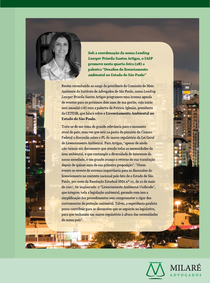 Priscila Santos Artigas, leading lawyer do escritório Milaré Advogados, coordena a palestra "Desafios do licenciamento ambiental no Estado de São Paulo", promovida pelo IASP, hoje, em SP. (Clique aqui)