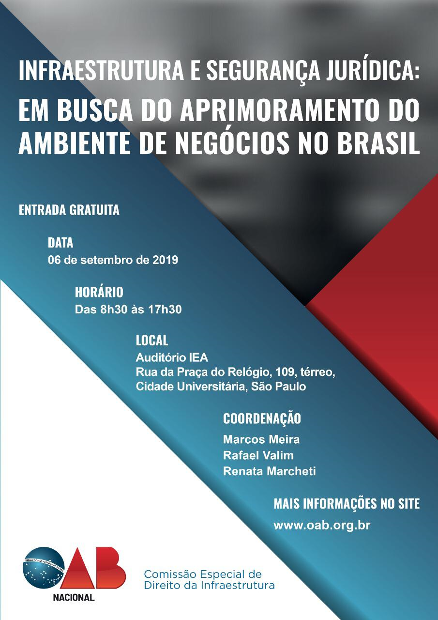 O Conselho Federal da OAB promove, dia 6/9, em SP, o evento "Infraestrutura e Segurança Jurídica: Em busca do aprimoramento do ambiente de negócios no Brasil". A entrada é gratuita. (Clique aqui)