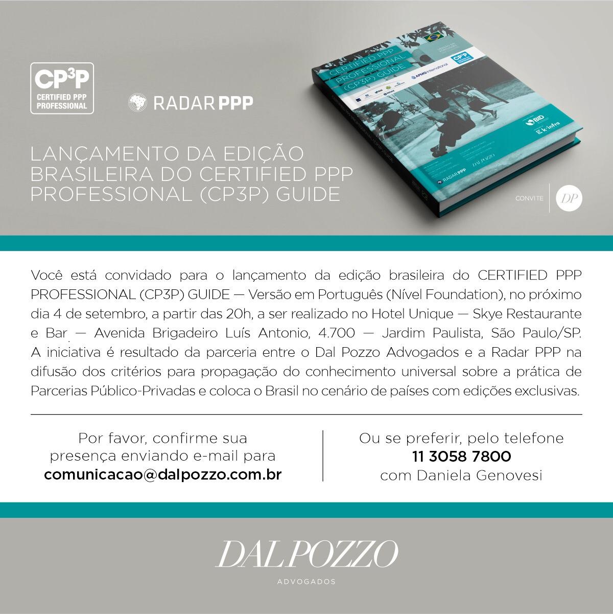 O escritório Dal Pozzo Advogados lança, hoje, a edição brasileira do "Certified PPP Professional (CP3P) Guide". O evento será em SP, no Hotel Unique, a partir das 20h. (Clique aqui)