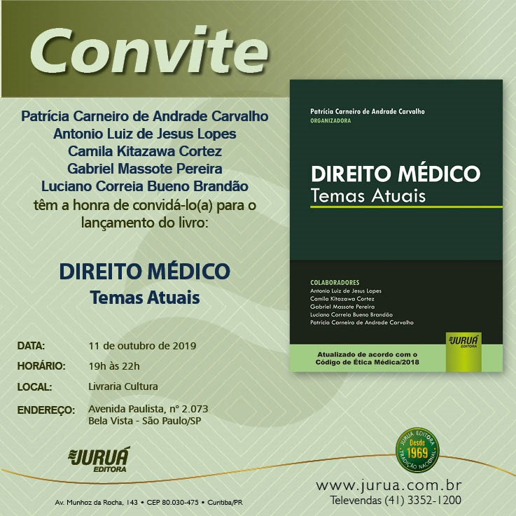 Será lançado no dia 11/10 o livro "Direito Médico - Temas Atuais", organizado por Patrícia Carneiro de Andrade Carvalho. O evento será em SP, na Livraria Cultura, das 19 às 22h. (Clique aqui)