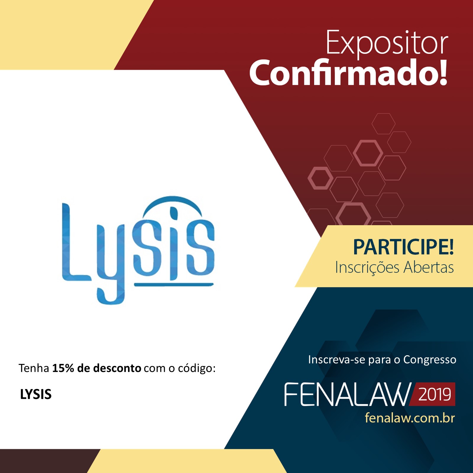 O LYSIS, software jurídico da Techway Informática, é uma das empresas confirmadas como expositora na Fenalaw 2019. Obtenha um desconto exclusivo de 15% sobre o valor de tabela da inscrição da Fenalaw, que será realizada de 23 a 25/10, usando o código: LYSIS. (Clique aqui)