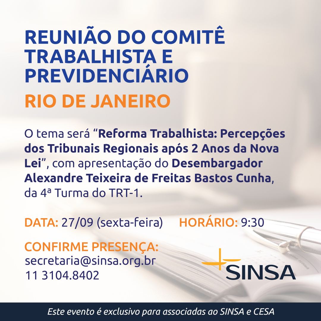 No dia 27/9, no RJ, será realizada a reunião do Comitê Trabalhista e Previdenciário do SINSA - Sindicato das Sociedades de Advogados dos Estados de São Paulo e Rio de Janeiro, com o tema "Reforma Trabalhista: Percepções dos Tribunais Regionais após 2 anos da Nova Lei". A apresentação será do desembargador Alexandre Teixeira de Freitas Bastos Cunha, da 4ª Turma do TRT-1. A reunião é exclusiva para associados do CESA e SINSA. (Clique aqui)