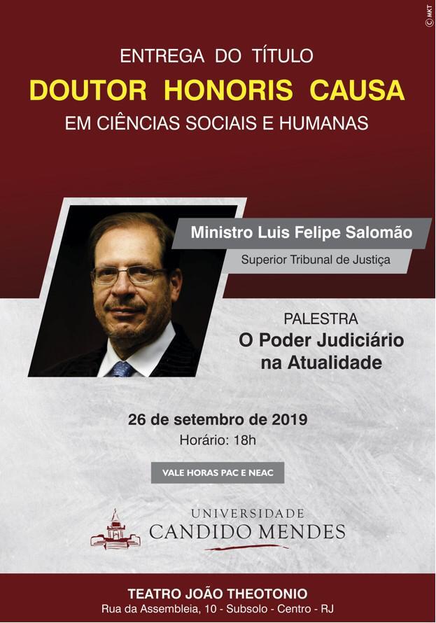 No dia 26/9, às 18h, na Universidade Cândido Mendes, o ministro Luis Felipe Salomão recebe o título "Doutor Honoris Causa em Ciências Sociais e Humanas". Na ocasião terá palestra sobre "O Poder Judiciário na Atualidade". (Clique aqui)