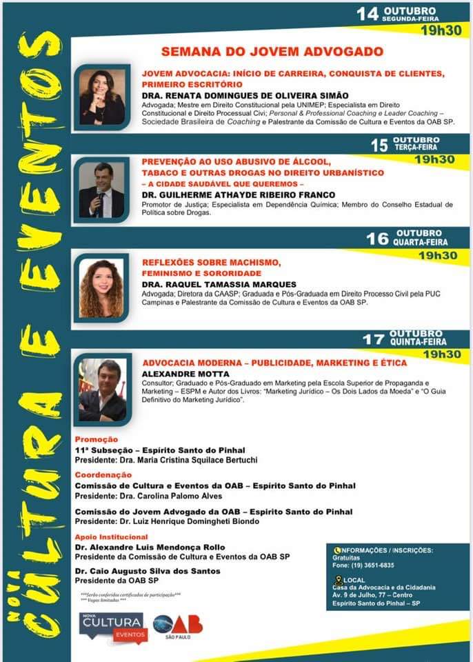 Hoje, às 19h30, o consultor e palestrante Alexandre Motta, do Grupo Inrise, ministrará a palestra "Advocacia Moderna - Publicidade, Marketing e Ética", em Espírito Santo do Pinhal/SP. Participe! (Clique aqui)