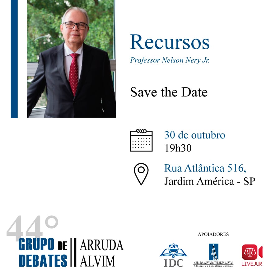 Arruda Alvim e Thereza Alvim Advocacia e Consultoria Jurídica realiza, dia 30/10, às 19h30, em SP, o "44° Encontro do Grupo de Debates Arruda Alvim". Como convidado especial, o professor Nelson Nery Jr. irá falar sobre "Recursos Especial e Extraordinário". (Clique aqui)