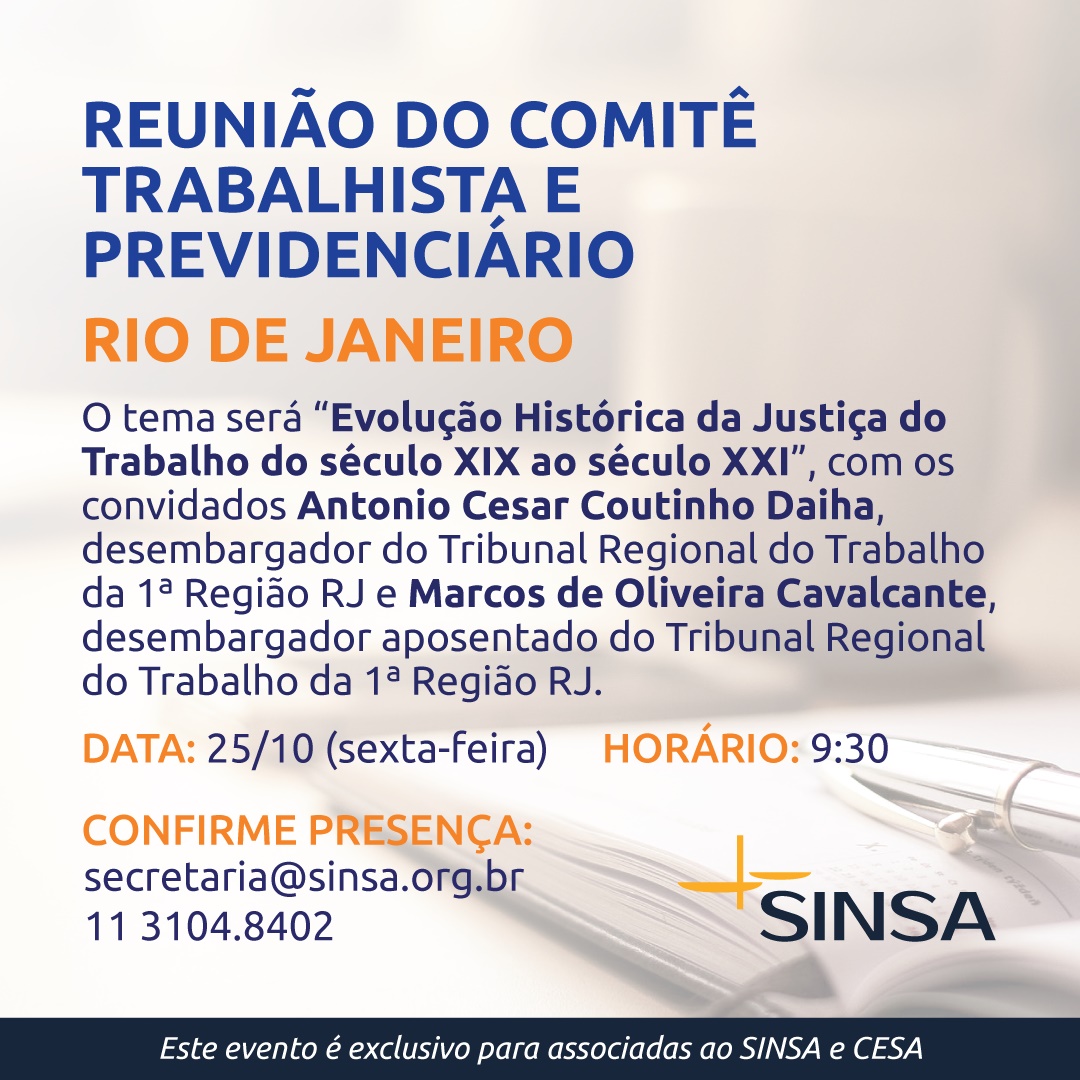 No dia 25/10, no RJ, será realizada a reunião do Comitê Trabalhista e Previdenciário do SINSA - Sindicato das Sociedades de Advogados dos Estados de São Paulo e Rio de Janeiro, com o tema "Evolução Histórica da Justiça do Trabalho do século XIX ao século XXI". A apresentação será de Antonio Cesar Coutinho Daiha, desembargador do TRT da 1ª região do RJ e Marcos de Oliveira Cavalcante, desembargador aposentado. A reunião é exclusiva para associados do CESA e SINSA. (Clique aqui)