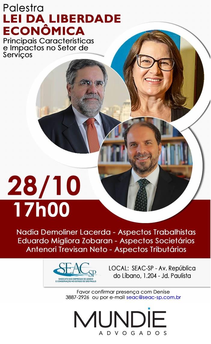 Sócios do escritório Mundie e Advogados, Antenori Trevisan Neto, Eduardo Zobaran e Nadia Demoliner Lacerda apresentam palestra no evento promovido pelo SEAC SP - Sindicato das Empresas de Asseio e Conservação no Estado de São Paulo - sobre a "Declaração de Direitos de Liberdade Econômica". Dia 28/10, às 17h, em SP. (Clique aqui)