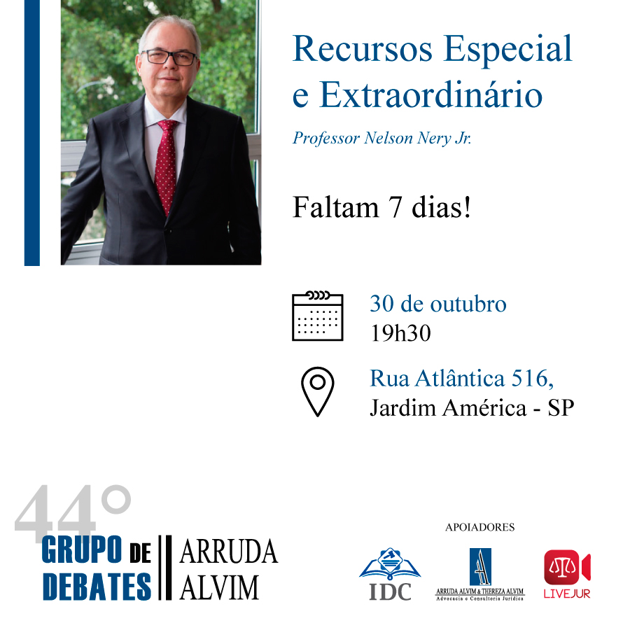 Arruda Alvim e Thereza Alvim Advocacia e Consultoria Jurídica realiza, dia 30/10, às 19h30, em SP, o "44° Encontro do Grupo de Debates Arruda Alvim". Como convidado especial, o professor Nelson Nery Jr. irá falar sobre "Recursos Especial e Extraordinário". (Clique aqui)