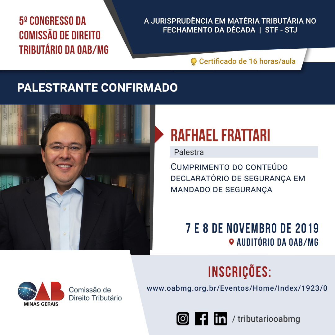 Dias 7 e 8/11, ocorre o "5º Congresso da Comissão de Direito Tributário da OAB/MG", evento que tem a participação do escritório Vilas Boas Lopes e Frattari Advogados. No Congresso, Rafhael Frattari, sócio da área Tributária da banca, falará sobre "O cumprimento do conteúdo declaratório da sentença em mandado de segurança", especialmente para discutir a jurisprudência do STJ sobre o caso. (Clique aqui)