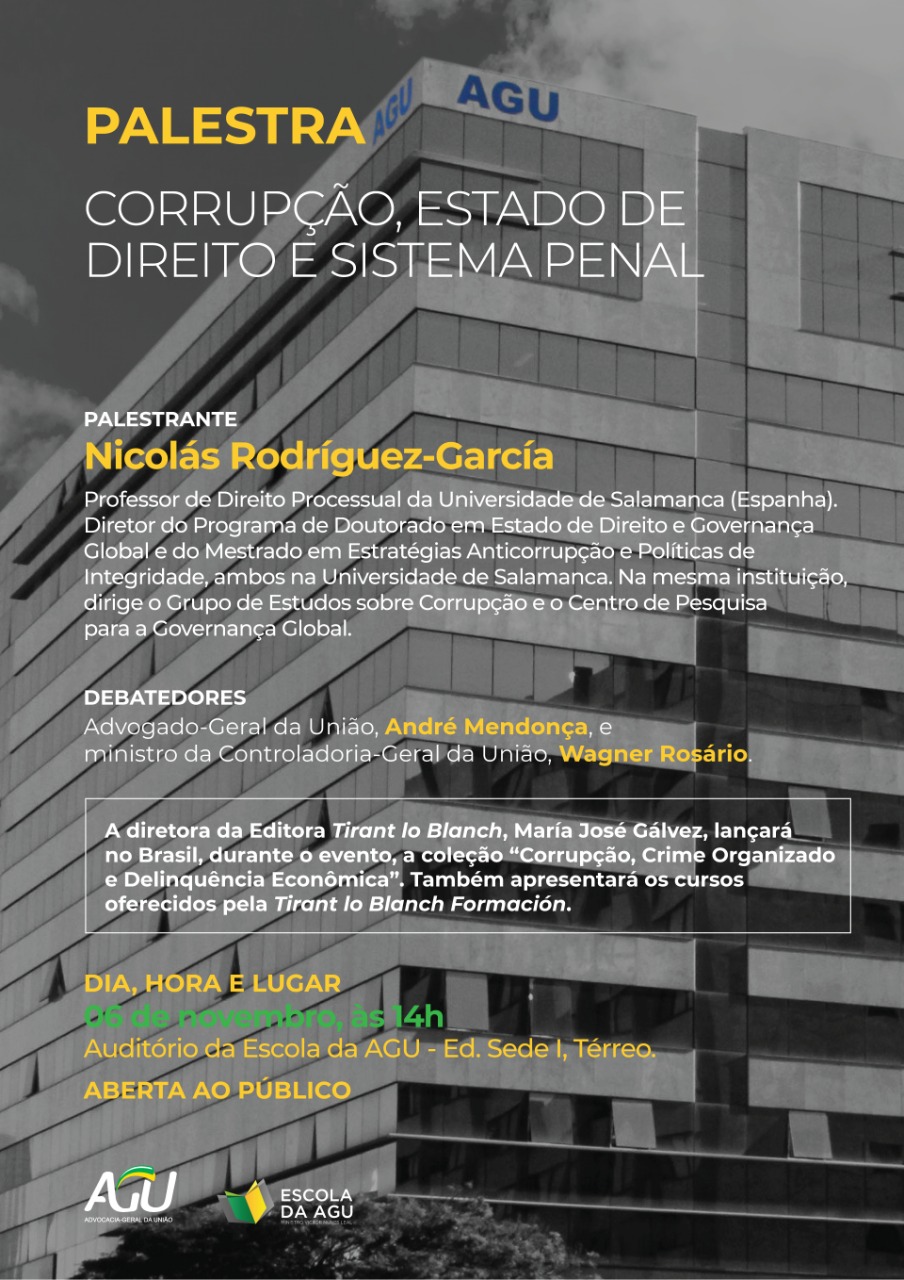 A AGU realiza no dia 6/11 a palestra "Corrupção, Estado de Direito e Sistema Penal", que terá como palestrante Nicolás Rodríguez-García, professor de Direito Processual da Universidade de Salamanca (Espanha). Os ministros André Mendonça (AGU) e Wagner Rosário (CGU) serão os debatedores. O evento acontece no Auditório da Escola da AGU, em Brasília. (Clique aqui)