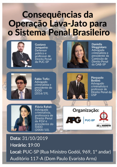 Acontece hoje, na PUC-SP o evento "Consequências da Operação Lava-Jato para o Sistema Penal Brasileiro". Serão palestrantes: Pierpaolo Cruz Bottini (Bottini & Tamasauskas Advogados), Daniella Meggiolaro (Malheiros Filho, Meggiolaro e Prado - Advogados), Fabio Tofic (Tofic Simantob Advogados e IDDD - Instituto de Defesa do Direito de Defesa), Flávia Rahal (Rahal, Carnelós e Vargas do Amaral Advogados) e Gustavo Junqueira (defensor público). (Clique aqui)