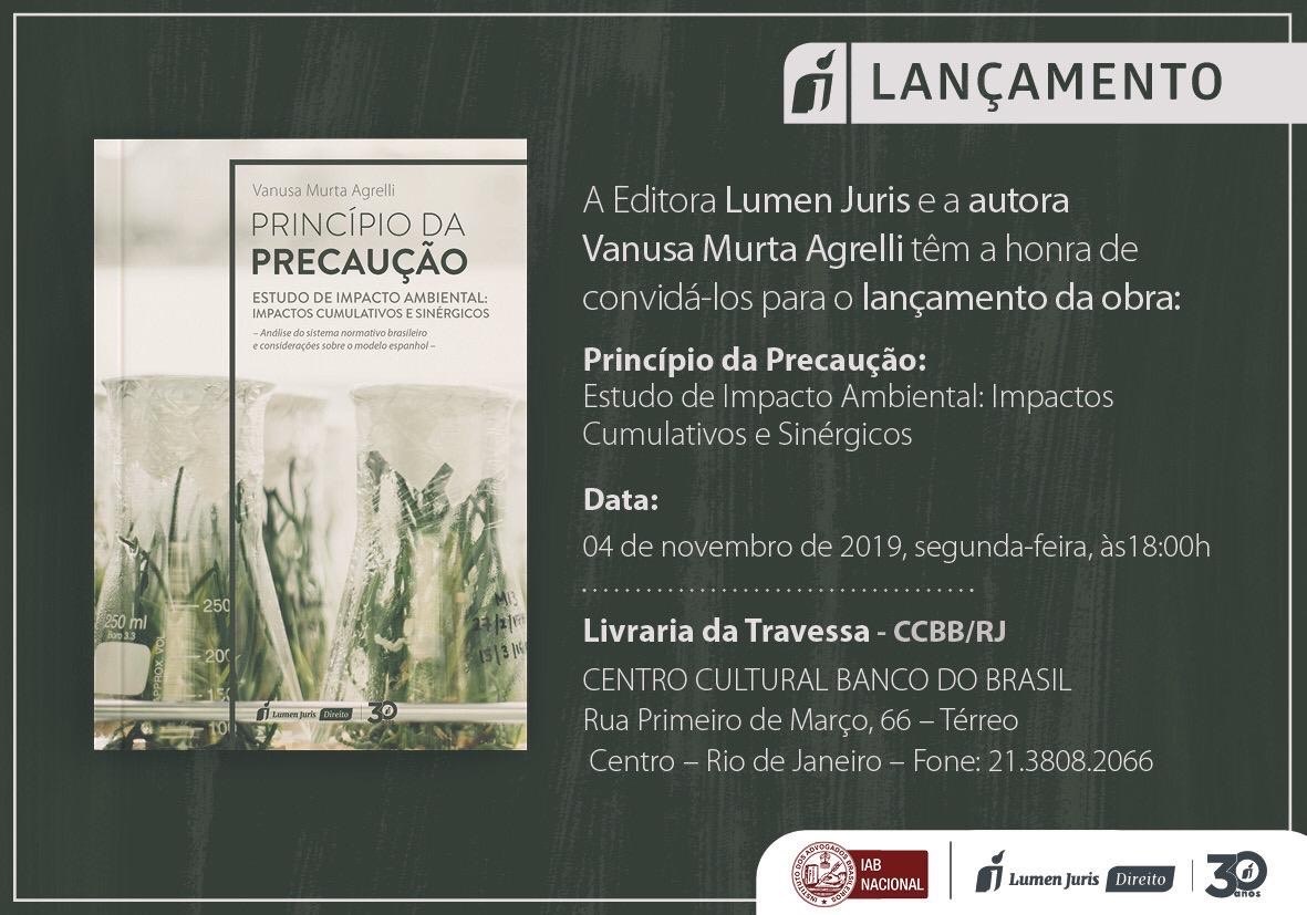 Acontece, no próximo dia 4, o lançamento do livro "Princípio da Precaução - Estudo de Impacto Ambiental: Impactos Cumulativos e Sinérgicos", de Vanusa Murta Agrelli. O evento será no RJ, na Livraria da Travessa, às 18h. (Clique aqui)