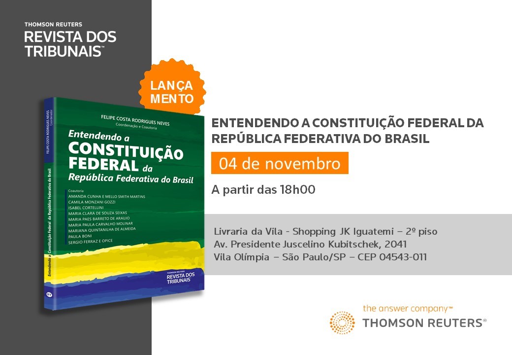 Será lançada, no próximo dia 4, a obra coletiva "Entendendo a Constituição Federal da República Federativa do Brasil", coordenada por Felipe Costa Rodrigues Neves. O evento será em SP, na Livraria da Vila do Shopping JK Iguatemi, a partir das 18h. (Clique aqui)