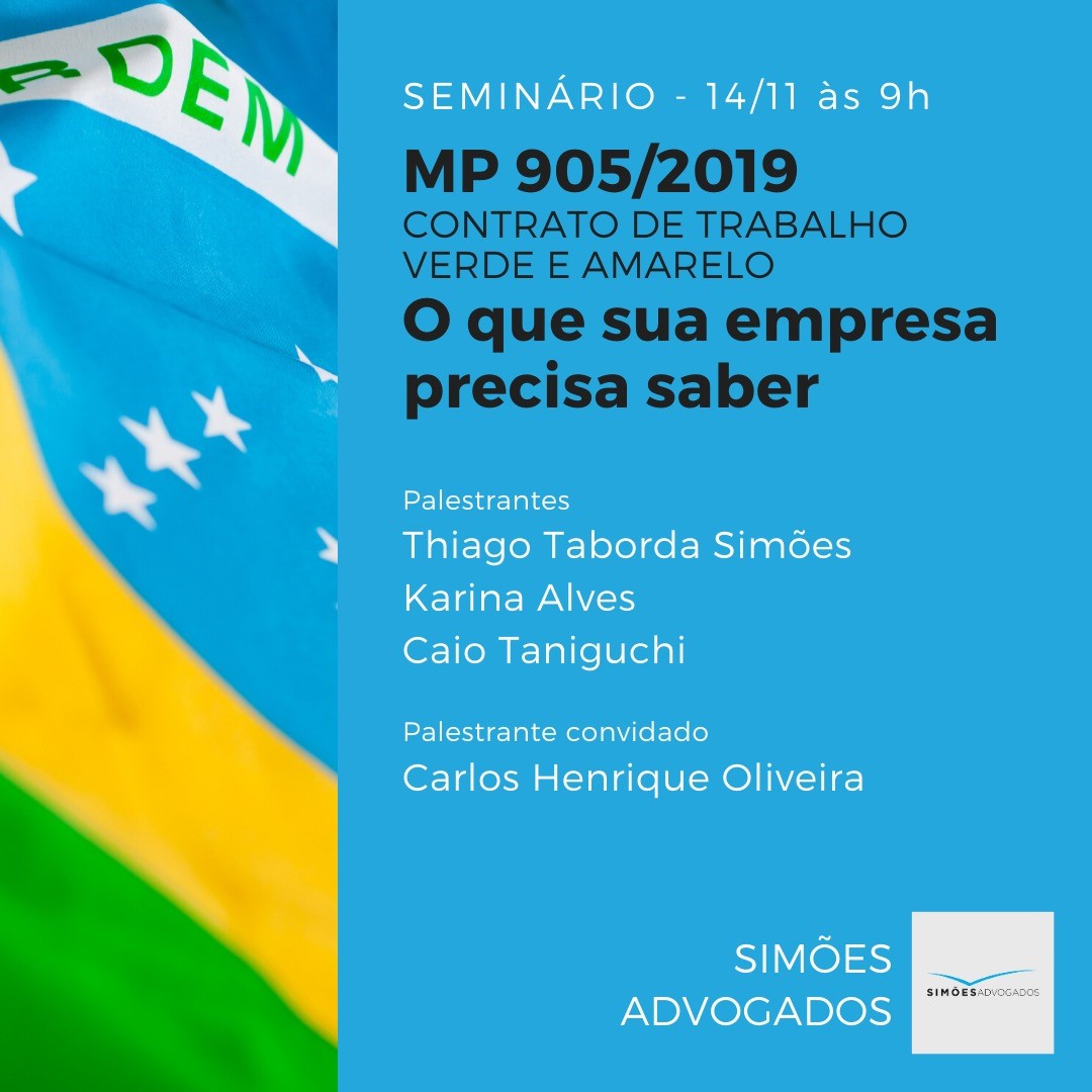 O escritório Simões Advogados realiza amanhã o seminário "MP 905/2019 Contrato de trabalho verde e amarelo. O que sua empresa precisa saber", com palestras dos advogados Thiago Taborda Simões, Karina Alves e Caio Taniguchi. Como convidado, falará o professor Carlos Henrique de Oliveira, auditor fiscal da Receita Federal e consultor Tributário FMI. (Clique aqui)