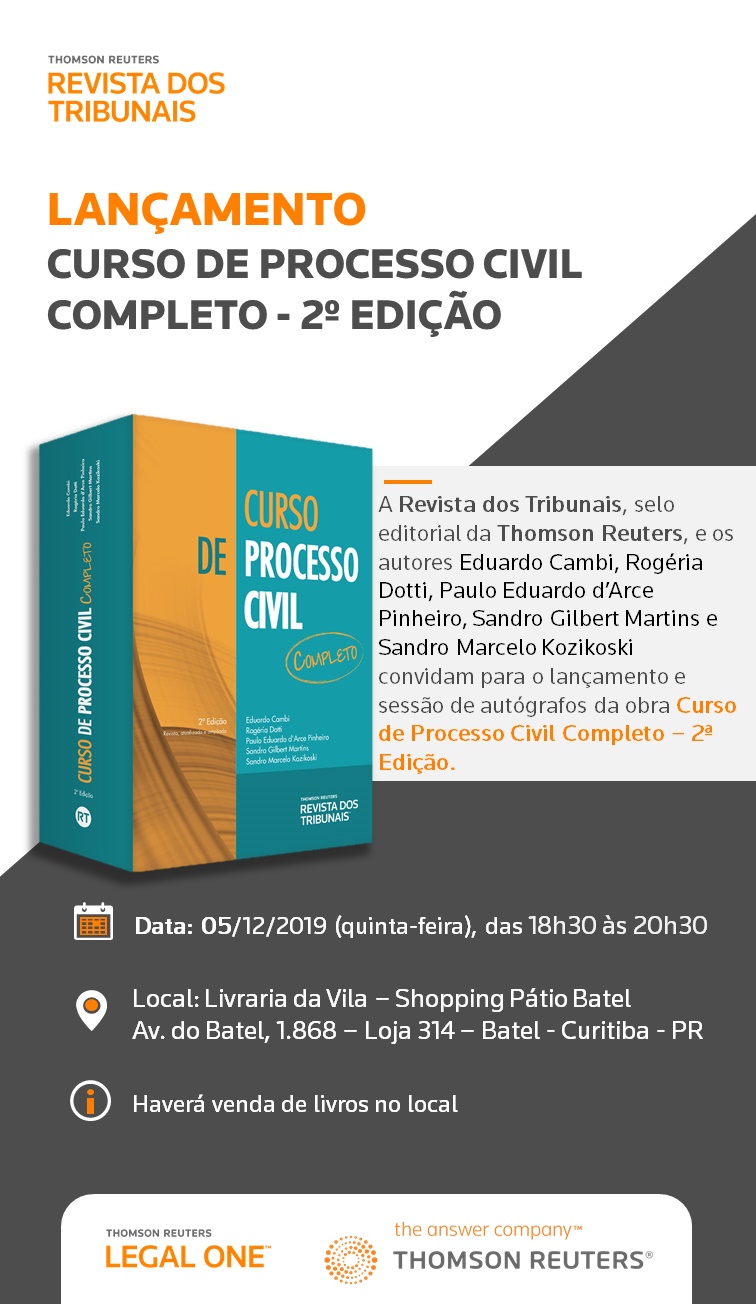 No próximo dia 5, os autores Eduardo Cambi, Rogéria Dotti, do Escritório Professor René Dotti, Paulo Eduardo d'Arce Pinheiro, Sandro Gilbert Martins e Sandro Marcelo Kozikoski lançam a 2ª edição do livro "Curso de Processo Civil Completo". O evento será em Curitiba/PR, na Livraria da Vila do Shopping Pátio Batel, das 18h30 às 20h30. (Clique aqui)