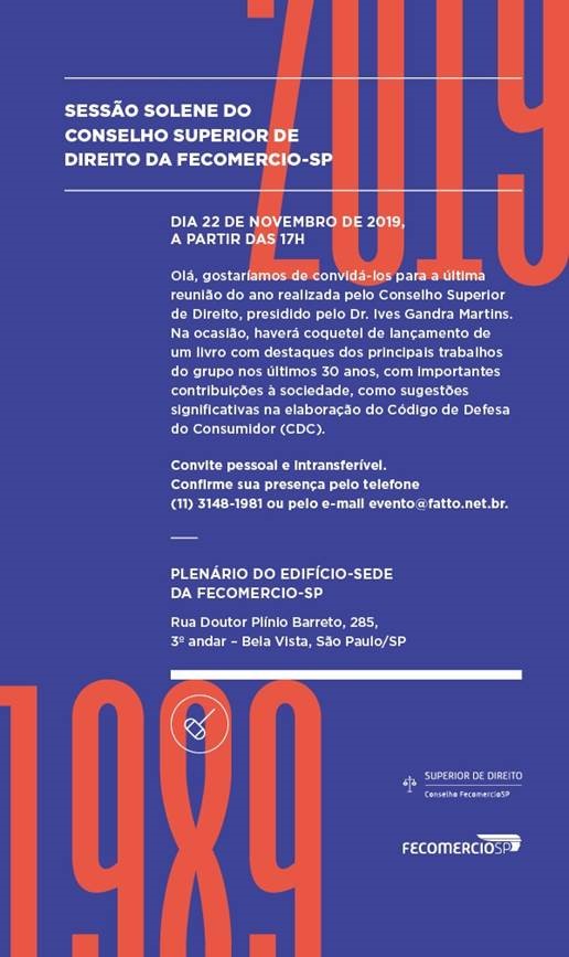 O Conselho Superior de Direito da FecomercioSP, presidido por Ives Gandra Martins, da Advocacia Gandra Martins, reúne-se no dia 22/11 para celebrar os 30 anos do grupo. Na ocasião, haverá o lançamento de um livro com destaques dos principais trabalhos realizados pelo Conselho nesse período, com importantes contribuições à sociedade, como sugestões significativas na elaboração do CDC. (Clique aqui)