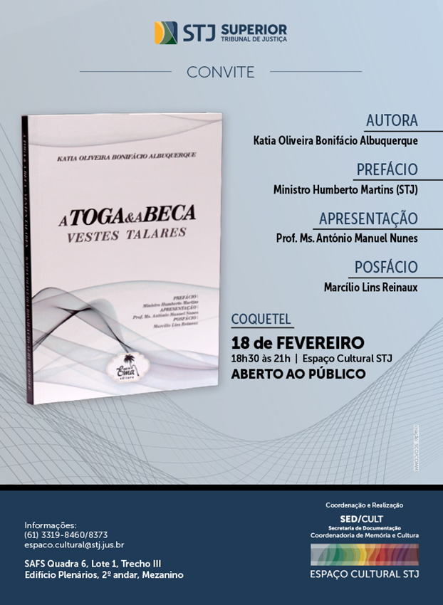 Acontece, hoje, o lançamento do livro "A Toga e a Beca - Vestes Talares", de Katia Oliveira Bonifácio Albuquerque. O evento será em Brasília, no Espaço Cultural STJ, das 18h30 às 21h. (Clique aqui)