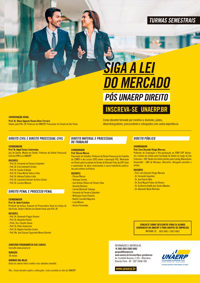 Esta semana começam as aulas na Unaerp. Últimas vagas para os cursos "Direito Civil e Direito Processual Civil"; "Direito Público: Constitucional, Administrativo e Tributário"; "Direito Material e Processual do Trabalho" e "Direito Penal e Processo Penal". A coordenação geral é do professor Olavo Augusto Vianna Alves Ferreira. Inscreva-se! (Clique aqui)