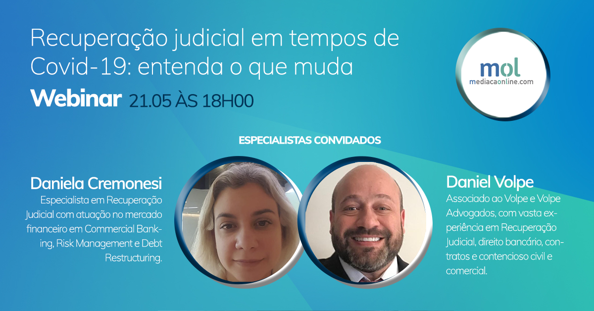 A MOL - Mediação Online promove, dia 21/5, às 18h, o webinar "Recuperação judicial em tempos de Covid-19: entenda o que muda". (Clique aqui)
