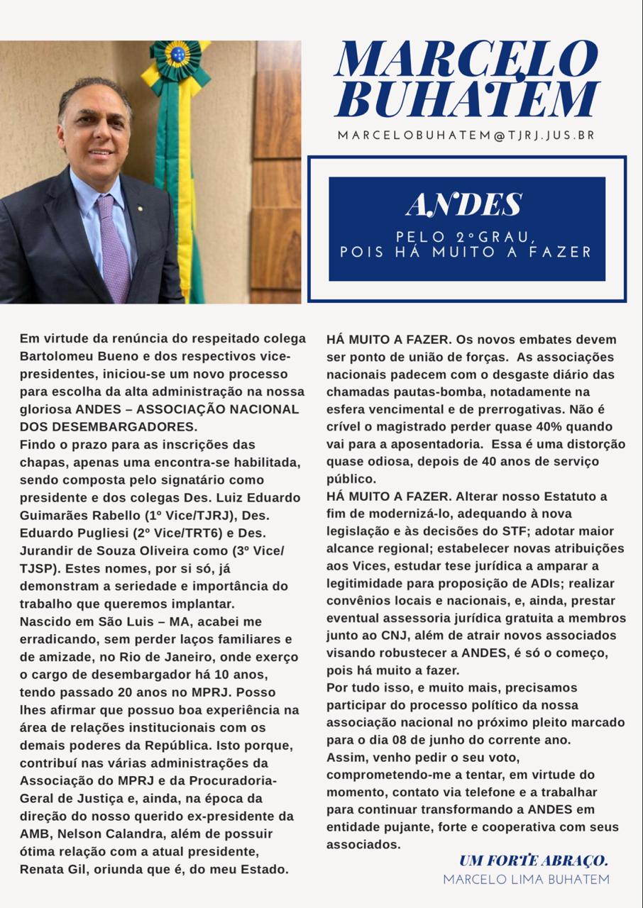 Aconteceu ontem a eleição para a escolha da alta administração da ANDES - Associação Nacional dos Desembargadores, tendo sido eleito como presidente Marcelo Buhatem e os desembargadores Luiz Eduardo Guimarães Rabello (1º vice), Eduardo Pugliesi (2º vice) e Jurandir de Souza Oliveira (3º vice). (Clique aqui).