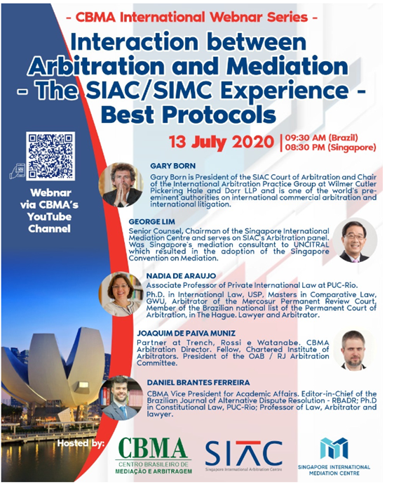 Hoje, o CBMA - Centro Brasileiro de Mediação e Arbitragem promove o webinar internacional "Interação entre arbitragem e mediação", que abordará a sintonia entre os diferentes centros de arbitragens do mundo, com destaque para os melhores protocolos do SIAC/SIMC, de Singapura. A transmissão será feita pelo canal do YouTube do CBMA. Palestram Gary Born e George Lim, com moderação do advogado Joaquim de Paiva Muniz (Trench Rossi Watanabe) e da professora Nádia de Araújo. (Clique aqui)