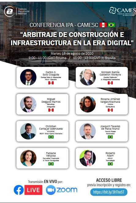 Acontece hoje, a conferência "Arbitraje de construcción e infraestructura en la era digital", do Instituto Peruano de Arbitragem e da CAMESC, com participação de Joaquim de Paiva Muniz (Trench Rossi Watanabe) e Christian Carbajal (BGM - Braz Gama Monteiro). Inscreva-se aqui.
