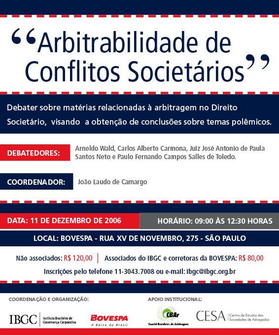 Na próxima segunda-feira, 11/12, acontece o seminário "Arbitrabilidade de Conflitos Societários". O evento tem o apoio do CESA - Centro de Estudos das Sociedades de Advogados e será realizado, a partir das 9h, na BOVESPA (rua XV Novembro, 275-SP). Clique aqui para mais informações.