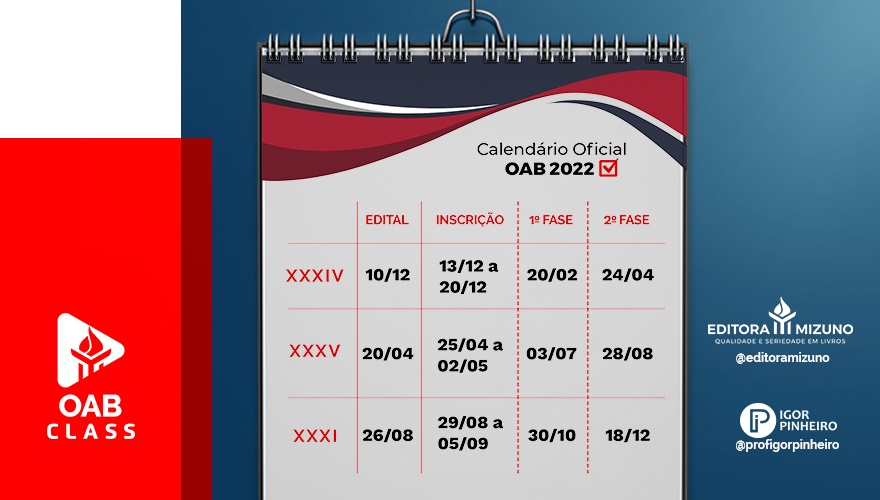 A Editora Mizuno disponibiliza o calendário oficial da OAB 2022. (Clique aqui) Não deixe de se preparar para as provas! Acompanhe o Instagram @oabclass para dicas diárias, mapas conceituais, material de apoio e muito mais!