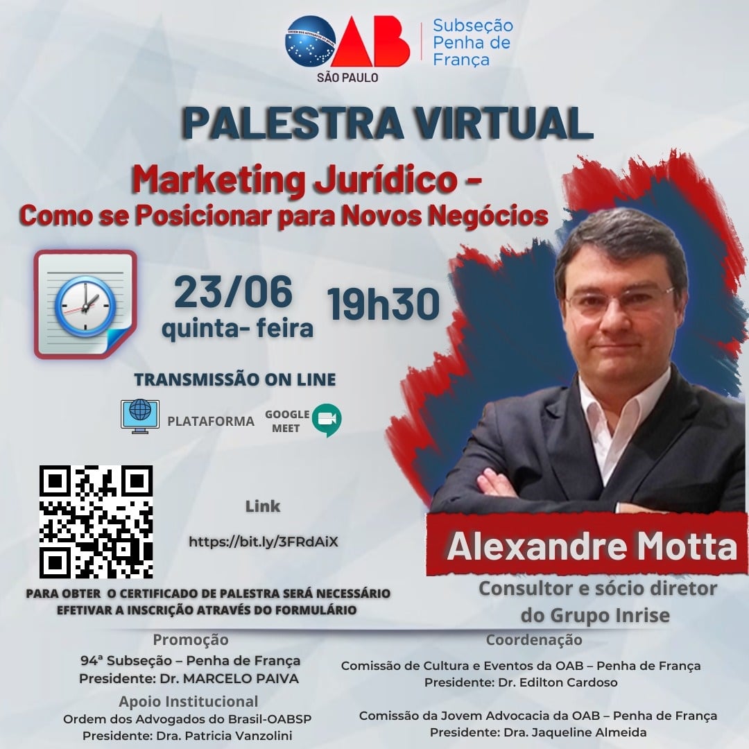 Acontece hoje, na OAB Penha, palestra do consultor Alexandre Motta, do Grupo Inrise, com o tema "Advogado - Como Se Posicionar para Novos Negócios" (clique aqui). O evento ocorre às 19h30. Inscreva-se! (Clique aqui)