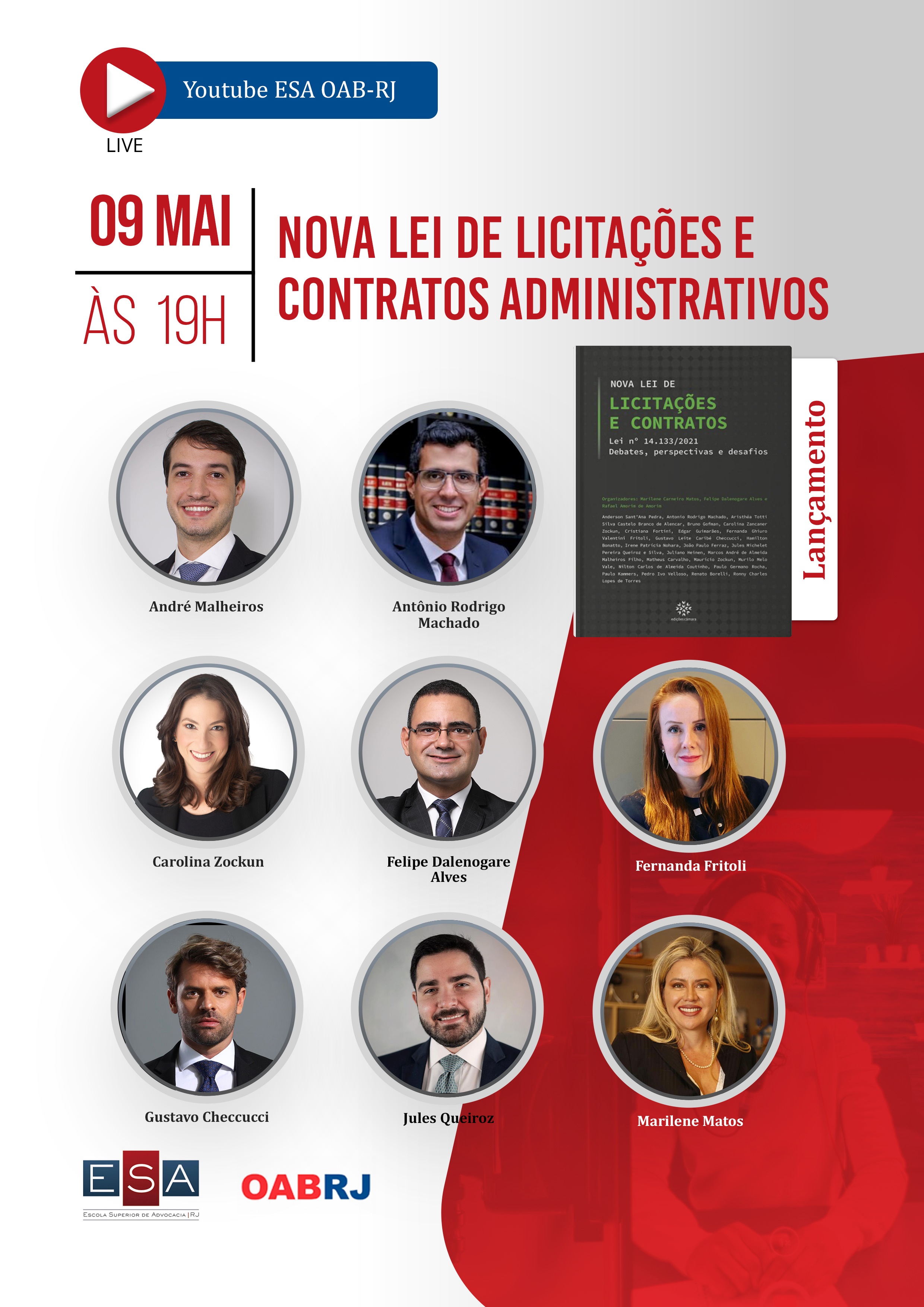 Dia 9/5, às 19h, o livro "Nova Lei de Licitações e Contratos Administrativos" (Edições Câmara - 370 pg.), organizado por Marilene Carneiro Matos, Felipe Dalenogare Alves e Rafael Amorim de Amorim, será lançado com palestra virtual (clique aqui), no canal da ESA OAB/RJ, no YouTube. (Clique aqui)