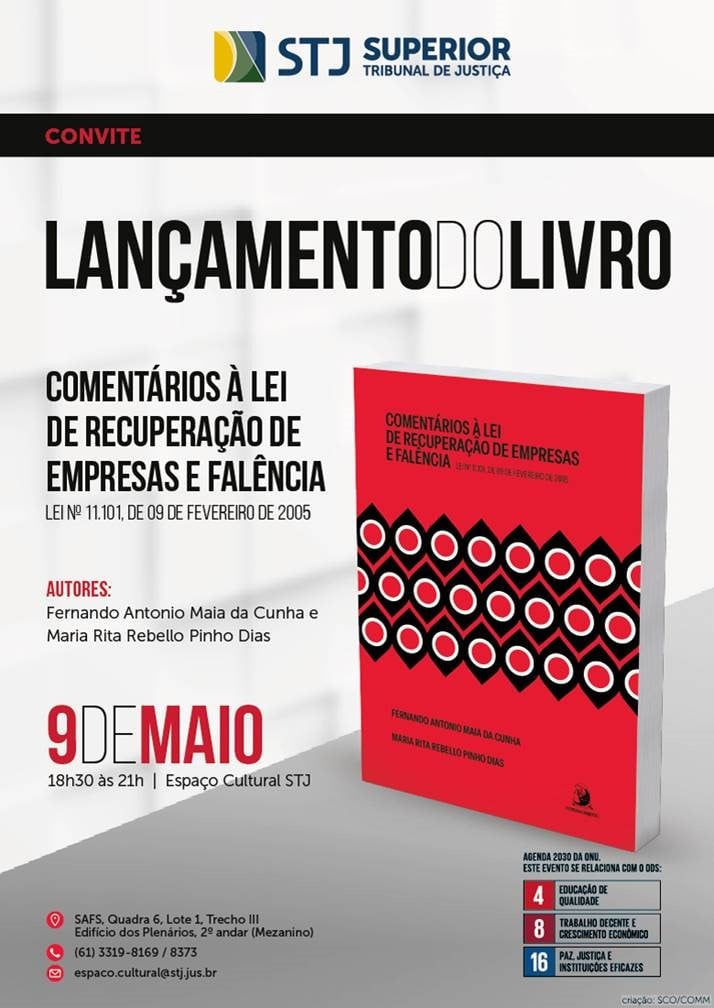 Dia 9/5, das 18h30 às 21h, no Espaço Cultural do STJ, será lançado o livro "Comentários à Lei de Recuperação de Empresas e Falência" (Contracorrente - 800 pg.), de autoria de Fernando Antonio Maia de Cunha e Maria Rita Rebello Pinho Dias. (Clique aqui)