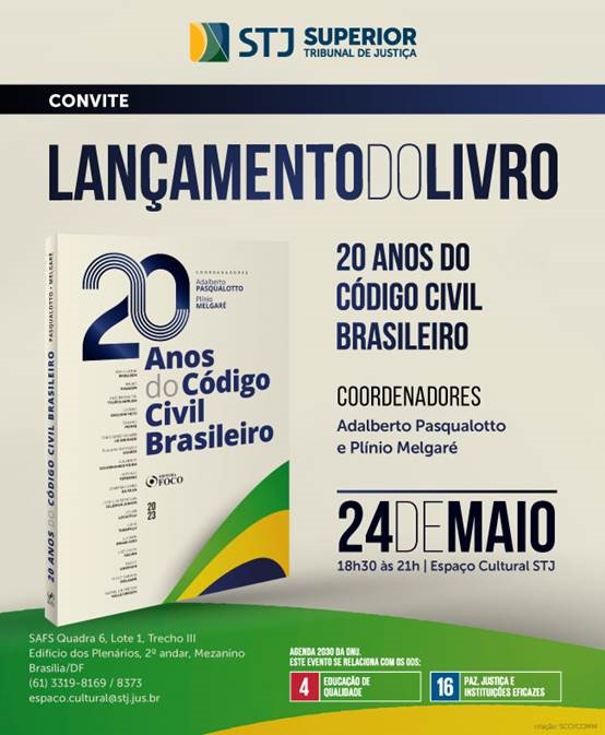 Dia 24/5, das 18h30 às 21h, no Espaço Cultural STJ, acontece o lançamento da obra "20 anos do Código Civil Brasileiro" (Foco - 234pg.), coordenada por Adalberto Pasqualotto e Plínio Melgaré. (Clique aqui)