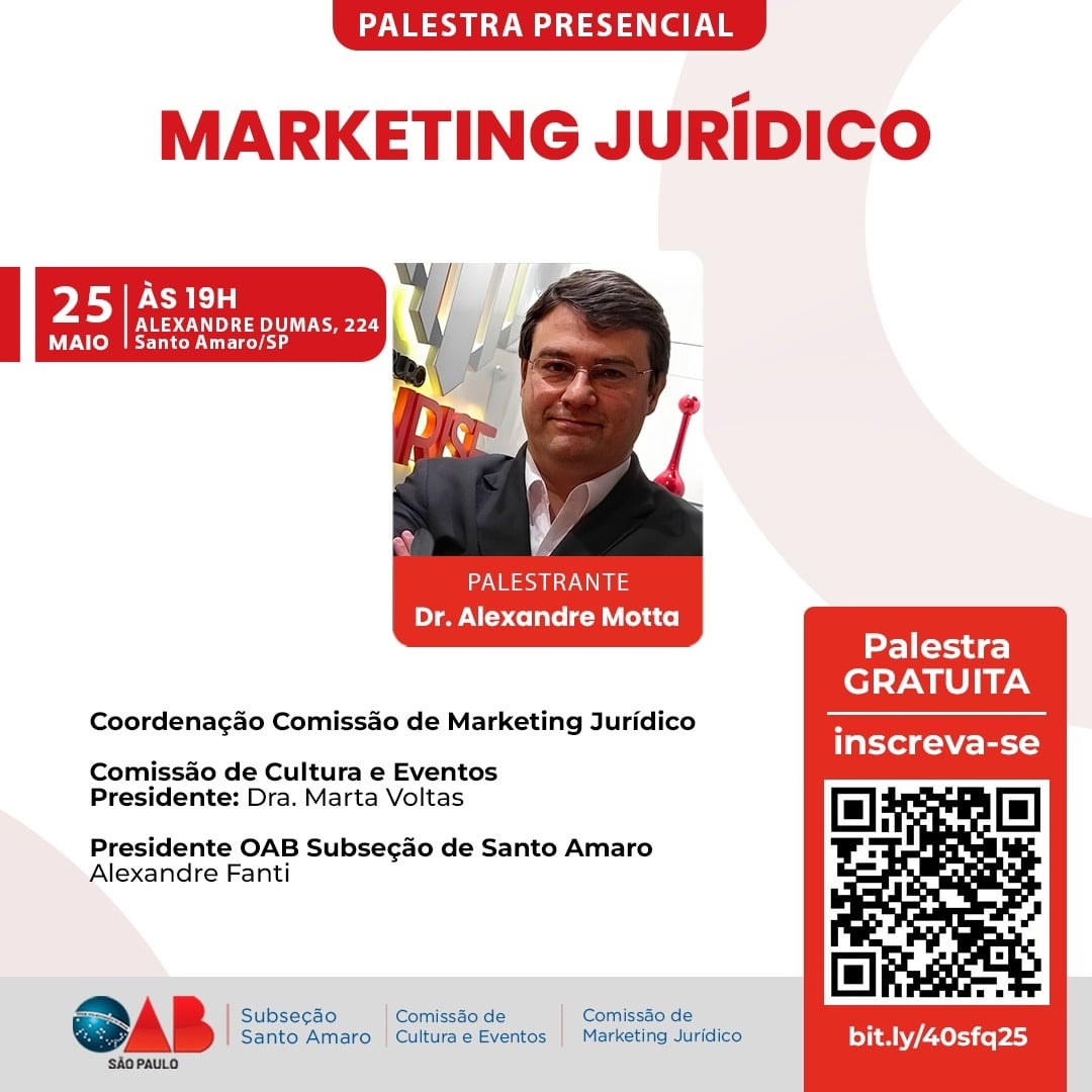 Consultor Alexandre Motta, do Grupo Inrise, ministra hoje, às 19h, uma palestra sobre marketing jurídico. O evento presencial acontece na OAB subseção Santo Amaro (rua Alexandre Dumas, 224). Para inscrições acesse o QRcode presente na imagem. (Clique aqui)