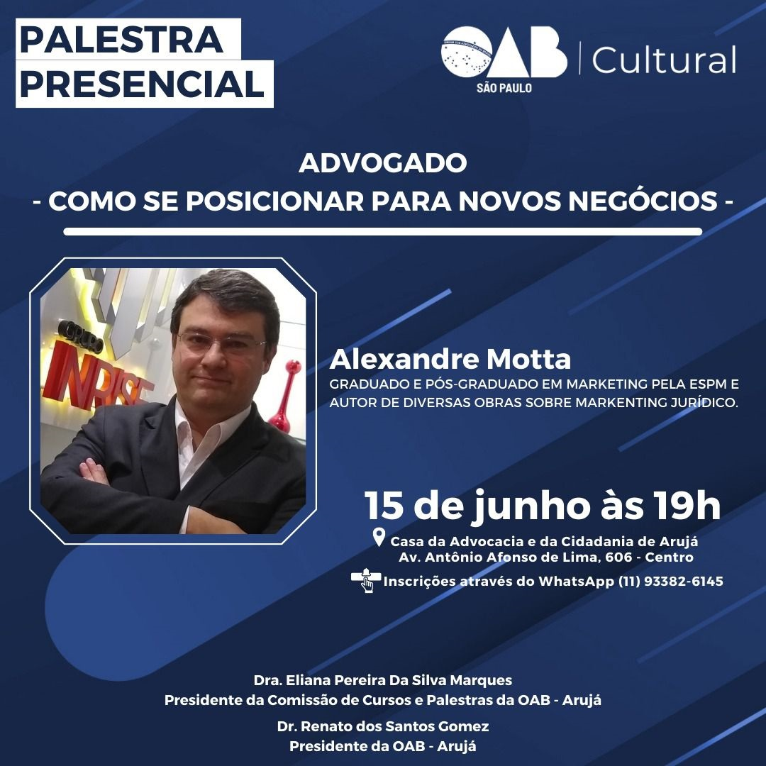 Hoje, às 19h, o consultor Alexandre Motta, do Grupo Inrise, ministrará a palestra "Marketing Jurídico: Como se posicionar para novos negócios", e responderá perguntas pontuais sobre o tema. O evento acontece na OAB Arujá (av. Antonio Afonso de Lima, 606 - Vila Lima I). Para informações, entre em contato com a subseção pelo telefone (11) 4653-2247. (Clique aqui)