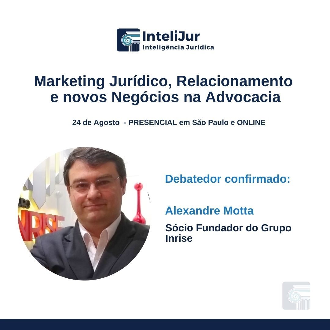 Hoje, às 14h, o consultor Alexandre Motta, do Grupo Inrise, será debatedor no painel "Como está o Marketing Jurídico no Brasil e no Mundo", do evento "Marketing Jurídico, Relacionamento e Novos Negócios na Advocacia" (clique aqui), em SP. A oportunidade traz à tona temas relevantes para aprimorar as estratégias de negócios no campo jurídico, buscando uma abordagem inovadora e diferenciada para o sucesso no mercado. (Clique aqui)