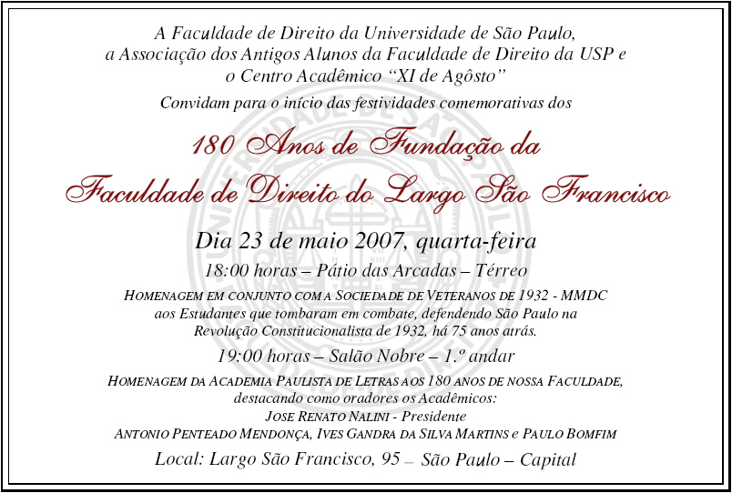 A Faculdade de Direito da USP, a Associação dos antigos alunos e o Centro Acadêmico "XI de agosto" convidam para o inicio das festividades comemorativas dos "180 Anos de Fundação da Faculdade de Direito do Largo São Francisco". Na quarta-feira, efeméride de 23 de maio, a partir das 18h, haverá uma homenagem aos veteranos que tombaram em combate na Revolução Constitucionalista de 1932. No mesmo dia, às 19h a Academia Paulista de Letras destaca os 180 anos das Arcadas. Clique aqui e confira.