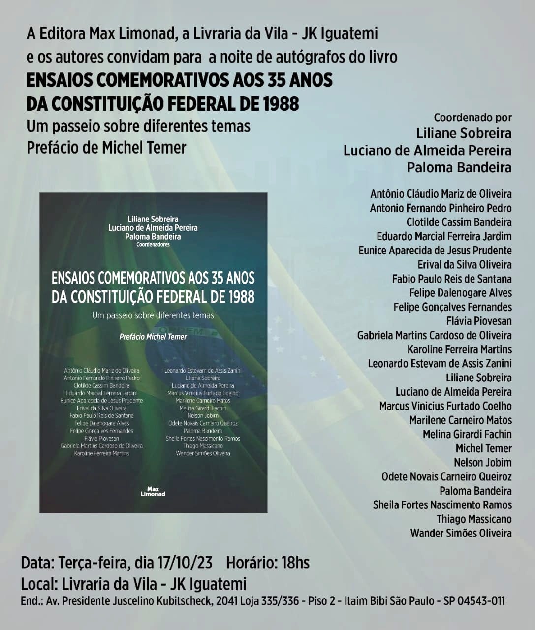 Hoje, a partir das 18h, na Livraria da Vila, no Shopping JK Iguatemi, em SP, acontece o lançamento da obra coletiva "Ensaios Comemorativos aos 35 anos da Constituição Federal de 1988 - Um passeio sobre diferentes temas" (Max Limonad), coordenada por Liliane Sobreira, Luciano de Almeida Pereira e Paloma Bandeira. (Clique aqui)