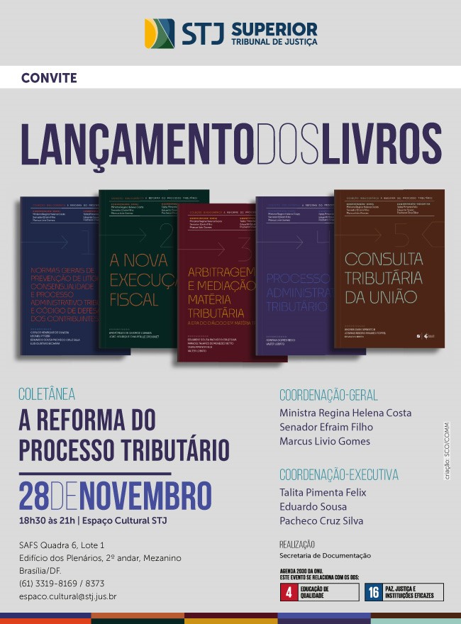 Espaço Cultural do STJ realiza, dia 28/11, das 18h30 às 21h, o lançamento da coletânea bibliográfica "A Reforma do Processo Tributário" (Editora Casa do Direito), composta de 5 volumes, com coordenação-geral da ministra Regina Helena Costa, senador Efraim Filho e Marcus Livio Gomes e coordenação-executiva de Talita Pimenta Felix e Eduardo Sousa Pacheco Cruz Silva. (Clique aqui)