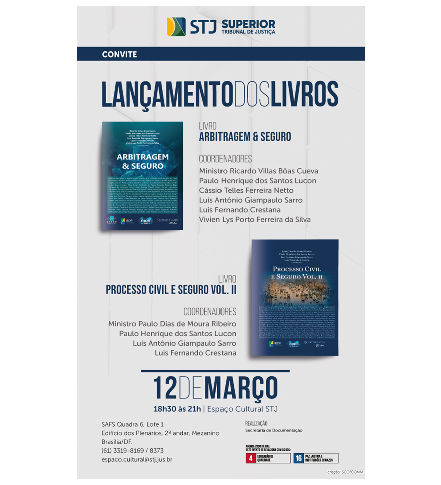 Espaço cultural do STJ promoverá no dia 12/3, das 18h30 às 21h, o lançamento dos livros "Arbitragem & Seguro" e "Processo Civil e Seguro Vol. II". (Clique aqui)