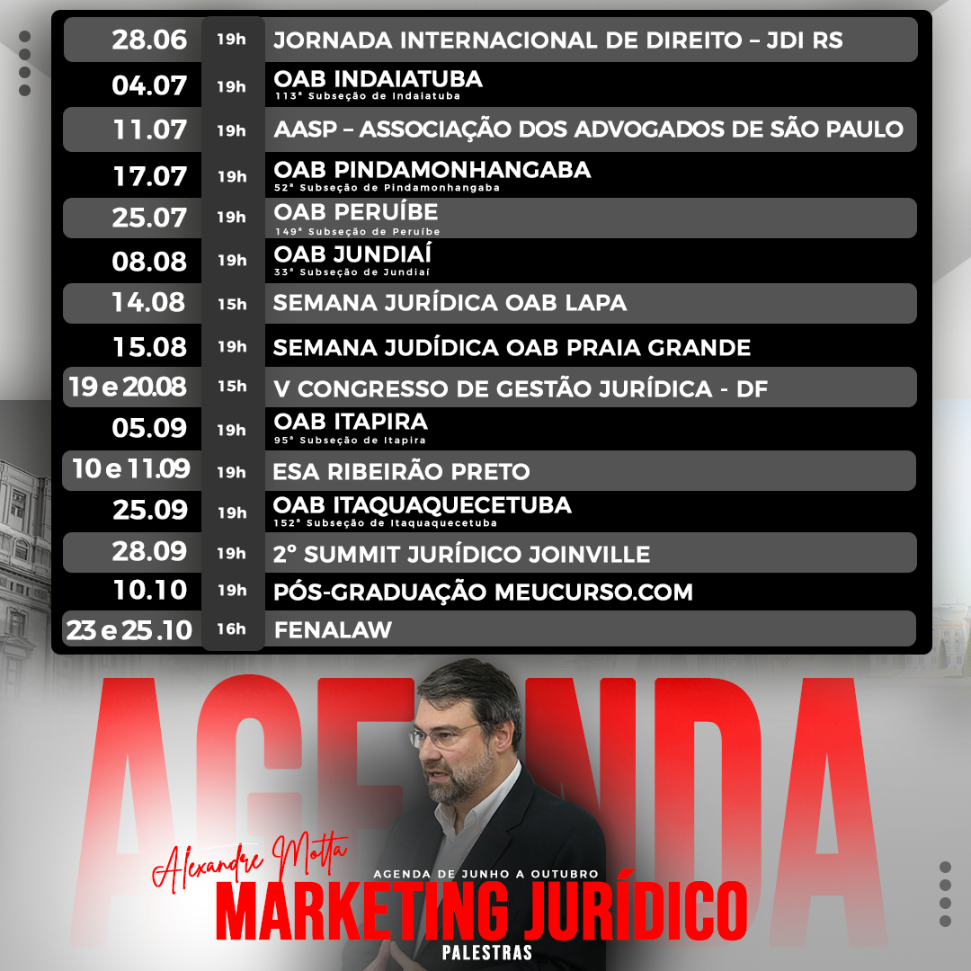 Grupo Inrise anuncia nova programação de palestras de marketing jurídico, ministradas pelo consultor Alexandre Motta. Entre em contato com a unidade do evento de interesse. (Clique aqui)