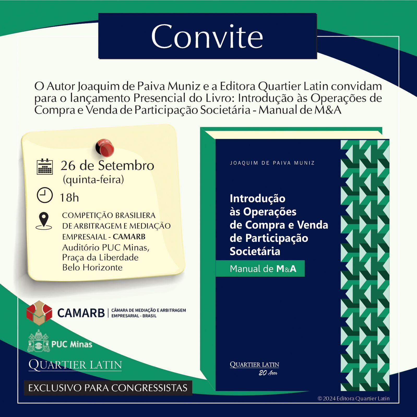 Joaquim de Paiva Muniz lança hoje, às 18h, a obra "Introdução às Operações de Compra e Venda de Participação Societária - Manual de M&A" (Editora Quartier Latin). O evento acontece durante a Competição Brasileira de Arbitragem e Mediação Empresarial da CAMARB, no auditório da PUC Minas, em BH. (Clique aqui)