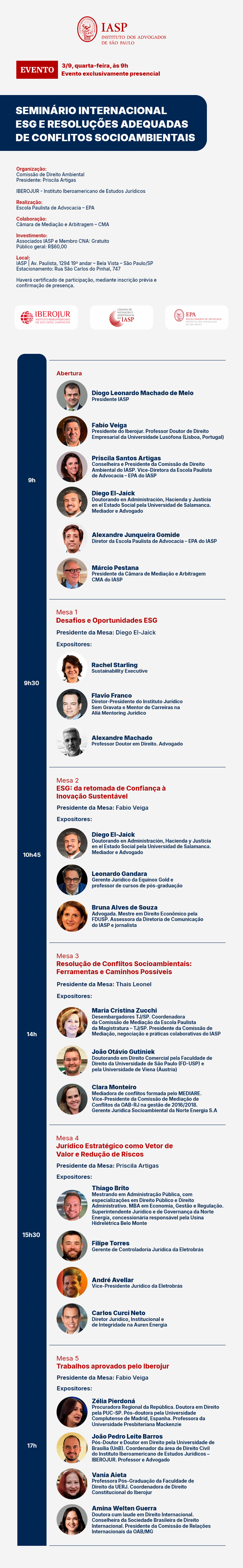 Hoje, o IASP promove o seminário internacional "ESG e Resoluções adequadas de Conflitos Socioambientais", reunindo especialistas para debater sustentabilidade, inovação e práticas jurídicas estratégicas. (Clique aqui)