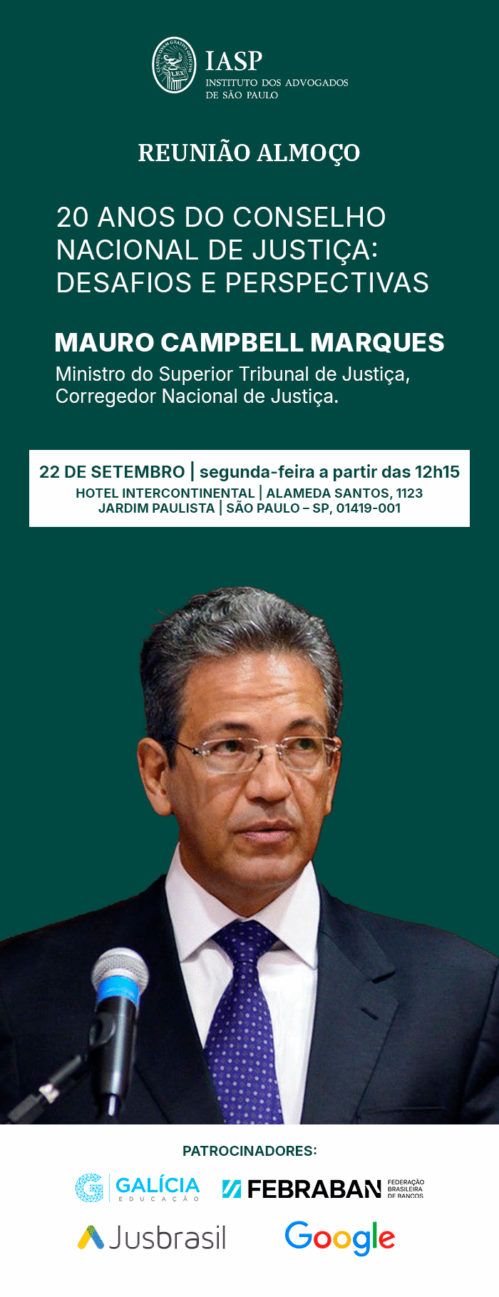 IASP recebe o ministro Mauro Campbell Marques em reunião-almoço, no dia 22/9, para debater os 20 anos do CNJ, seus desafios e perspectivas. (Clique aqui)